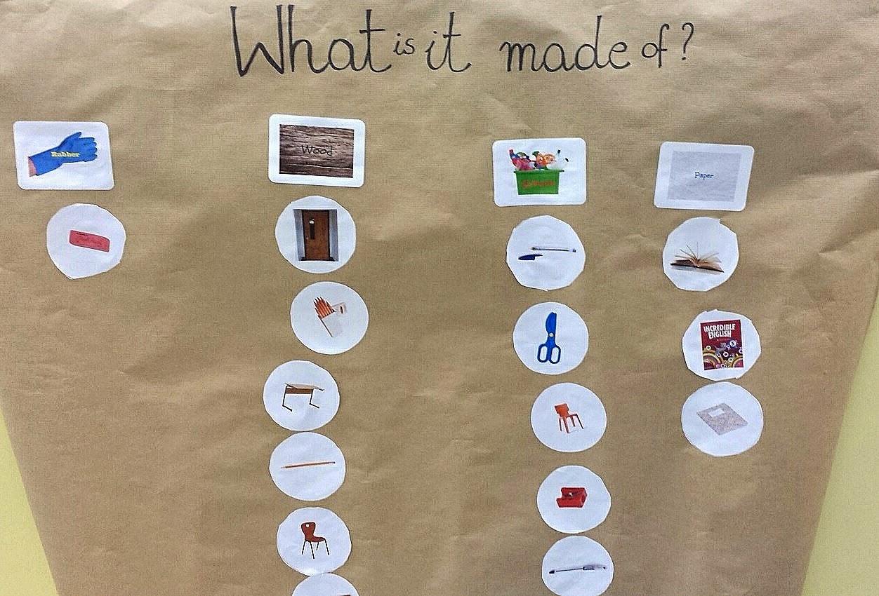 1. Wszystkie przedmioty wkładamy do torby, z której uczniowie wyjmują je po kolei. Przy pierwszych przedmiotach mówimy wyraźnie z czego są zrobione, np. It’s a plastic bottle, it’s MADE OF PLASTIC, It’s a kitchen spoon, it’s MADE OF WOOD etc. tak, by dzieci zrozumiały, że chodzi nam o materiał z jakiego coś jest wykonane. Przy kolejnych rzeczach można już pytać uczniów WHAT IS IT MADE OF? Na pewno szybko załapią słowa plastic i paper :).