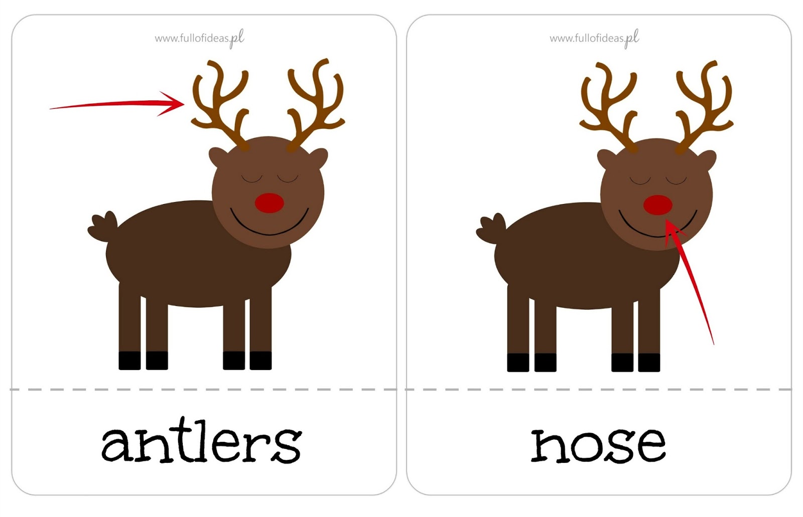 Na tym kanale znajdziecie dużo fajnych utworów, ale ten jest jednym z moich ulubionych i w tym roku postanowiłam wprowadzić go w grupach 4- i 5-latków. Do tego celu stworzyłam sobie reniferowe karty. Można wykorzystać je jako zwykłe flashcards, do gry w memory czy jako ćwiczenie z serii „find and match”, gdzie uczniowie mają za zadanie dopasować podpisy do odpowiednich obrazków :).