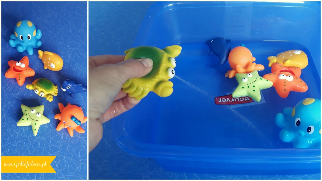 Najlepiej sprawdzą się gotowe, gumowe zwierzątka, które dodatkowo można napełnić wodą, a następnie kogoś nią spryskać. Koniecznie dajcie też dzieciom możliwość popluskania się w misce, przy okazji egzekwując powtórkę nazw podwodnych żyjątek – zobaczycie jaką to sprawi im frajdę!