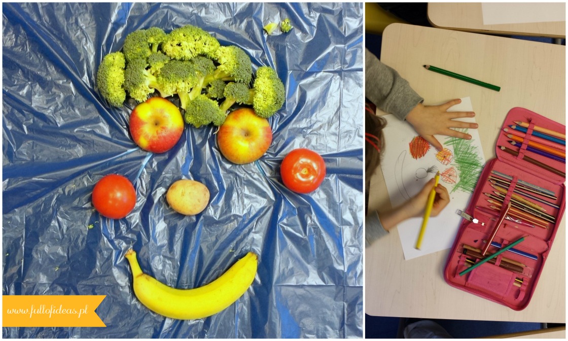 Układanie buziek z owoców może być świetną zabawą na lato. Podobny pomysł opisywałam na Facebooku już dość dawno, ale dwa dni temu, przy okazji porządków na pulpicie, wpadły mi w ręce zdjęcia z lekcji zatytułowanej „Let’s make a face”. W ramach powtórki nazw części twarzy wykorzystywaliśmy wówczas owoce i warzywa, z których dzieci układały buźki. Następnie uwieczniały je na swoich rysunkach. Zabawa była przednia! Ostatecznie niczego nie zjadaliśmy, ale gdyby tak wykorzystać tylko sezonowe, gotowe do zjedzenia smakołyki, może udałoby się nakłonić rodziców do wyrażenia zgody na konsumpcję ;),