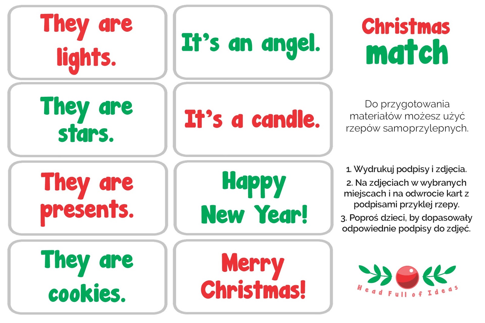 W pliku znajdziecie karty-zdjęcia ze świątecznym słownictwem oraz przygotowane przeze mnie podpisy. Zadaniem dzieci będzie dopasowywanie podpisów do odpowiednich obrazków.
